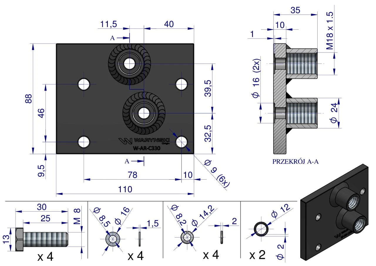 Adapter, pokrywa zewnętrznego rozdzielacza w ciągniku rolniczym URSUS C-330, C-330M Waryński. W komplecie z adaperem są śruby montażowe, podkładki, oringi. Za pomocą adapera można bezproblemowo zamontować zewnętrzny rozdzielacz w miejsce oryginalnego rozdzielacza w URSUS C-330.