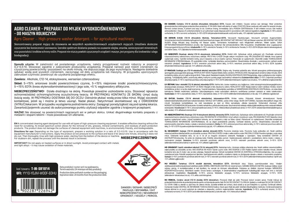 Agro Cleaner Preparat do myjek wysokociśnieniowych - do maszyn rolniczych 5l - koncentrat, TEGER Skoncentrowany preparat myjący do stosowania we wszystkich wysokociśnieniowych urządzeniach myjących. Skuteczne czyszczenie bez konieczności szorowania. Szerokie spektrum działania gwarantuje usuwanie olejów, smarów, zanieczyszczeń mineralnych oraz pozostałości po środkach ochrony roślin. Czyści skutecznie bez konieczności szorowania, nie niszczy powłok czyszczonych urządzeń i maszyn, przyjazny dla środowiska, ulega biodegradacji. Sposób użycia: Produkt przeznaczony do sporządzenia roztworu z wodą. Przed użyciem preparat należy rozcieńczyć w proporcji z wodą w zależności od stopnia zabrudzenia: 0.2-0.5:10. Stosować zgodnie z zaleceniami producenta urządzenia. Nanieść preparat pod niskim ciśnieniem na czyszczoną powierzchnie i pozostawić na minutę, nie dopuszczając do wyschnięcia. Następnie spłukać gruntownie wodą po wysokim ciśnieniem od dołu urządzenia/maszyny. W przypadku uporczywych zabrudzeń czynność powtórzyć, aż do osiągnięcia zamierzonego rezultatu. Utylizacja: Zawartość/pojemnik usuwać do autoryzowanego punktu utylizacji odpadów zgodnie z krajowymi przepisami.