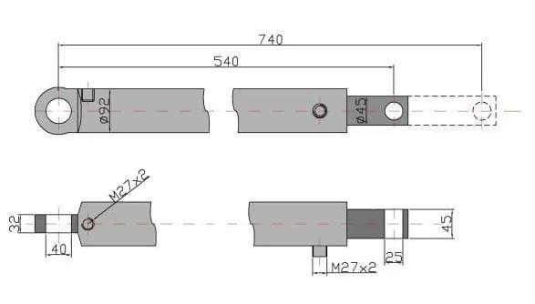 Cylinder hydrauliczny, siłownik, cyklop podpory lewy Kraj. Parametry techniczne: Długość minimalna: 540 mm Długość maksymalna: 740 mm Gwinty do podłączenia: M27x2/M27x2 Średnica otworów łożysk mocujących: 40/25 mm Średnica tłoczyska: 45 mm Średnica zewnętrzna cylindra: 92 mm Szerokość główki: 32/45 mm