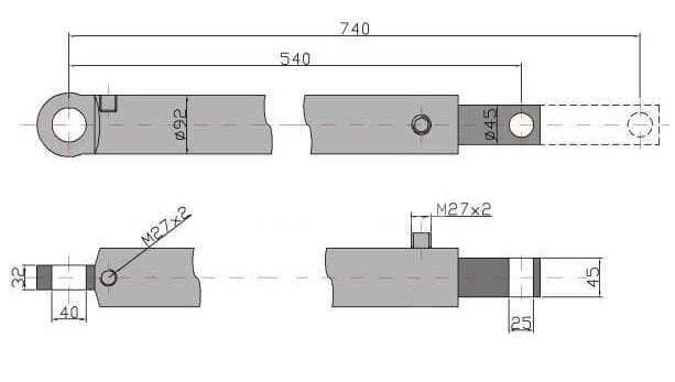 Cylinder hydrauliczny, siłownik, cyklop podpory prawy Kraj. Parametry techniczne: Długość minimalna: 540 mm Długość maksymalna: 740 mm Gwinty do podłączenia: M27x2/M27x2 Średnica otworów łożysk mocujących: 40/25 mm Średnica tłoczyska: 45 mm Średnica zewnętrzna cylindra: 92 mm Szerokość główki: 32/45 mm