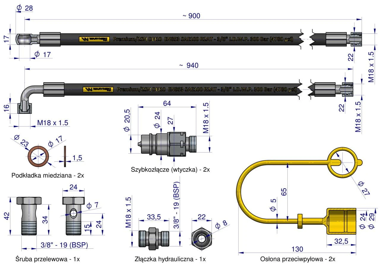 Łącznik centralny hydrauliczny w marce Waryński to nowa kategoria produktów hydraulicznych znajdująca zastosowanie w układzie przedniego i tylnego zawieszenia w ciągnikach rolniczych, maszynach przemysłowych i budowlanych.Podczas produkcji wykorzystano wysokiej jakości certyfikowane komponenty min. do produkcji tłoczyska wykorzysano stal chromowo-molibdenową ,wzmocniono również uszczelniacze , które są przystosowane do pracy w ekstremalnych warunkach ,kute haki i przyłącza gwarantują stabilne połączenie z maszyną. Łączniki hydrauliczne posiadają 24 miesięczną gwarancję.Łączniki zawierają : Zestaw przewodów śrubub przyłączeniowych wraz z szybkozłączem wtyczką Waryńskiego.