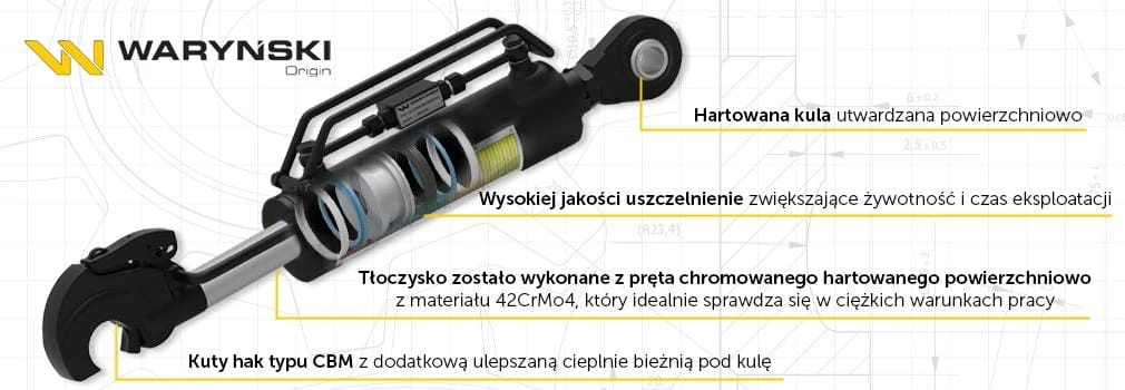 Łącznik centralny hydrauliczny w marce Waryński to nowa kategoria produktów hydraulicznych znajdująca zastosowanie w układzie przedniego i tylnego zawieszenia w ciągnikach rolniczych, maszynach przemysłowych i budowlanych.Podczas produkcji wykorzystano wysokiej jakości certyfikowane komponenty min. do produkcji tłoczyska wykorzysano stal chromowo-molibdenową ,wzmocniono również uszczelniacze , które są przystosowane do pracy w ekstremalnych warunkach ,kute haki i przyłącza gwarantują stabilne połączenie z maszyną. Łączniki hydrauliczne posiadają 24 miesięczną gwarancję.