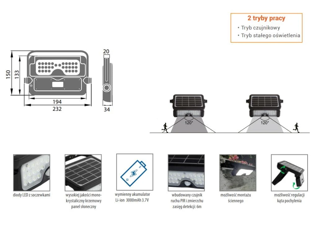 Naświetlacz solarny LED SOLEN 5W 500LM 4000K IP65 z czujnikiem ruchu