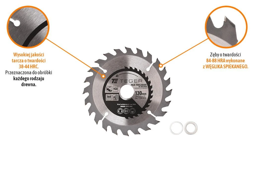 Piła tarczowa do drewna z węglikiem spiekanym 130x20x24T / TEGER przeznaczona do cięcia wzdłużnego i poprzecznego drewna litego, sklejki, płyt wiórowych, płyt laminowanych i MDF, materiałów drewnopodobnych i kompozytowych. Zęby widiowe z węglikiem spiekanym zapewnia długą żywotność tarczy przy intensywnej pracy.