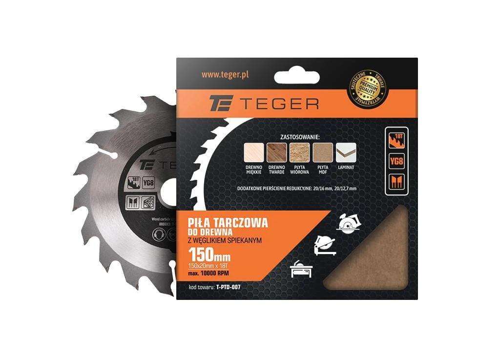 Piła tarczowa do drewna z węglikiem spiekanym 150x20x18T / TEGER przeznaczona do cięcia wzdłużnego i poprzecznego drewna litego, sklejki, płyt wiórowych, płyt laminowanych i MDF, materiałów drewnopodobnych i kompozytowych. Zęby widiowe z węglikiem spiekanym zapewnia długą żywotność tarczy przy intensywnej pracy.