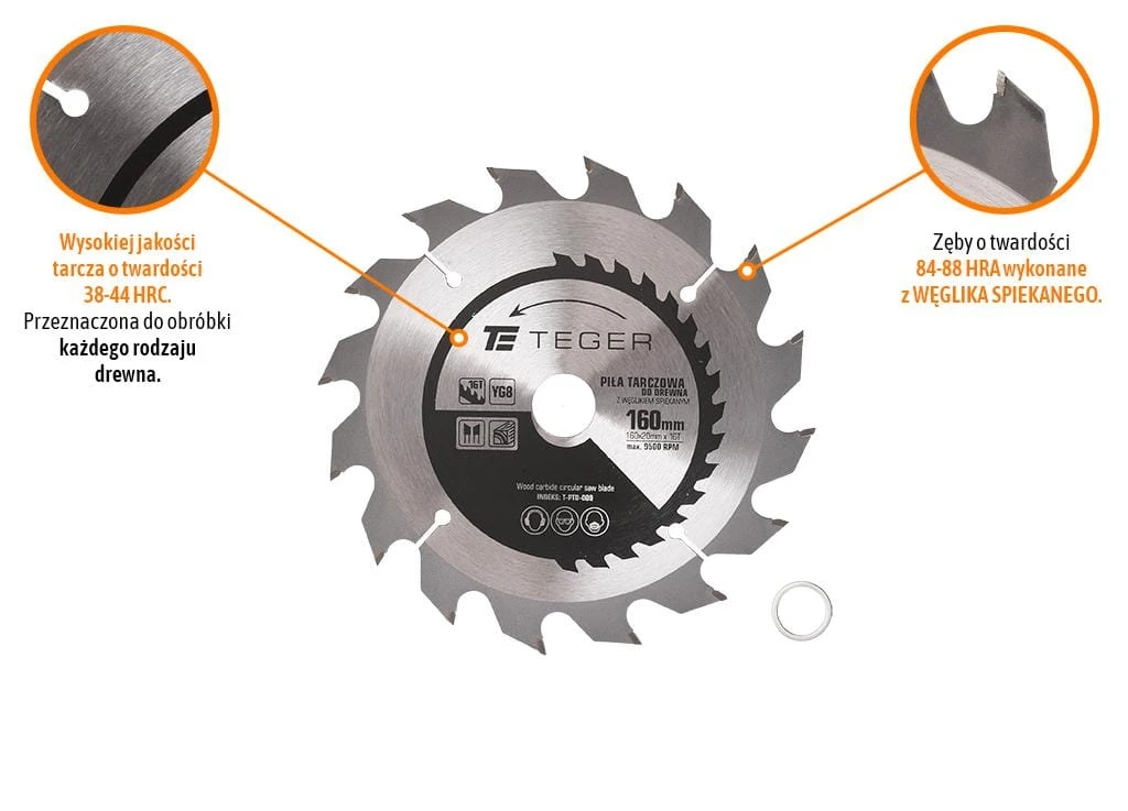 Piła tarczowa do drewna z węglikiem spiekanym 160x20x16T / TEGER przeznaczona do cięcia wzdłużnego i poprzecznego drewna litego, sklejki, płyt wiórowych, płyt laminowanych i MDF, materiałów drewnopodobnych i kompozytowych. Zęby widiowe z węglikiem spiekanym zapewnia długą żywotność tarczy przy intensywnej pracy.