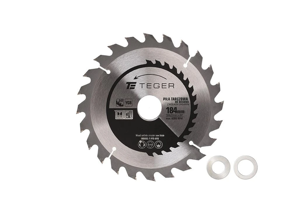 Piła tarczowa do drewna z węglikiem spiekanym 184x30x24T / TEGER przeznaczona do cięcia wzdłużnego i poprzecznego drewna litego, sklejki, płyt wiórowych, płyt laminowanych i MDF, materiałów drewnopodobnych i kompozytowych. Zęby widiowe z węglikiem spiekanym zapewnia długą żywotność tarczy przy intensywnej pracy.