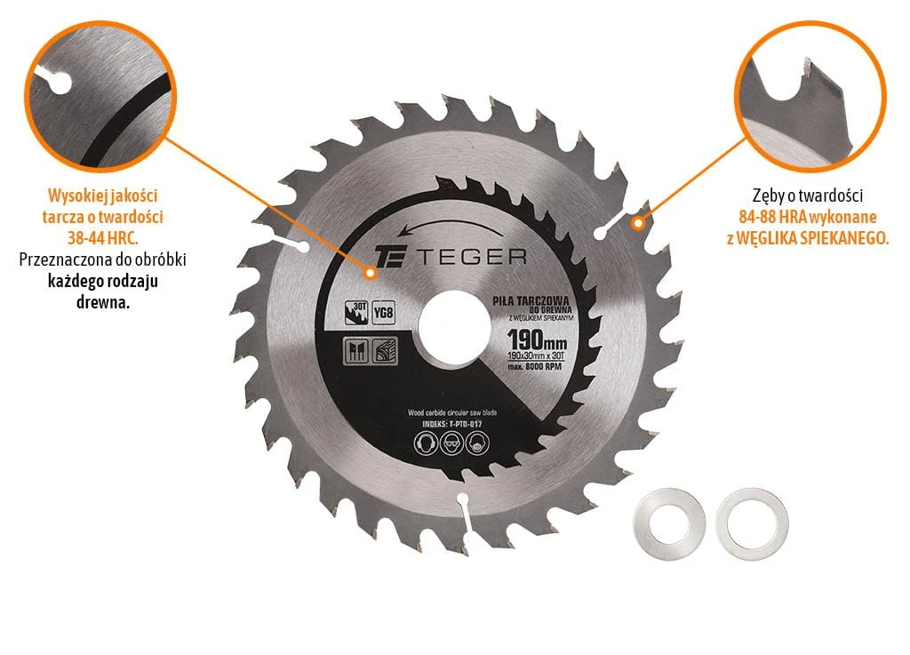 Piła tarczowa do drewna z węglikiem spiekanym 190x30x30T / TEGER przeznaczona do cięcia wzdłużnego i poprzecznego drewna litego, sklejki, płyt wiórowych, płyt laminowanych i MDF, materiałów drewnopodobnych i kompozytowych. Zęby widiowe z węglikiem spiekanym zapewnia długą żywotność tarczy przy intensywnej pracy.