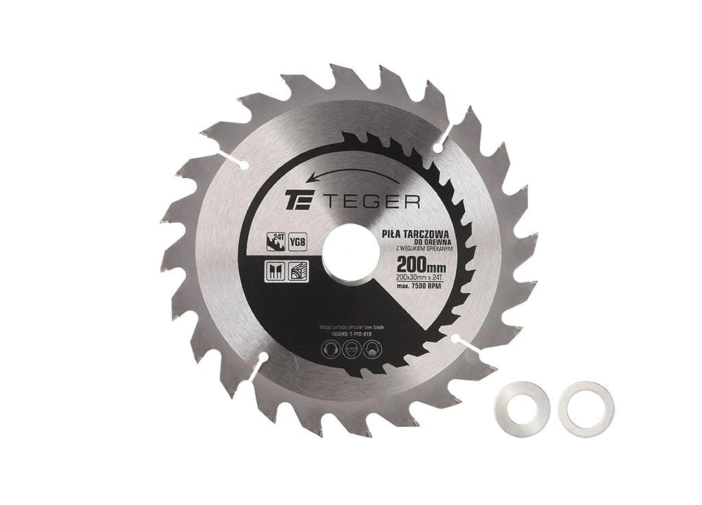Piła tarczowa do drewna z węglikiem spiekanym 200x30x24T / TEGER przeznaczona do cięcia wzdłużnego i poprzecznego drewna litego, sklejki, płyt wiórowych, płyt laminowanych i MDF, materiałów drewnopodobnych i kompozytowych. Zęby widiowe z węglikiem spiekanym zapewnia długą żywotność tarczy przy intensywnej pracy.