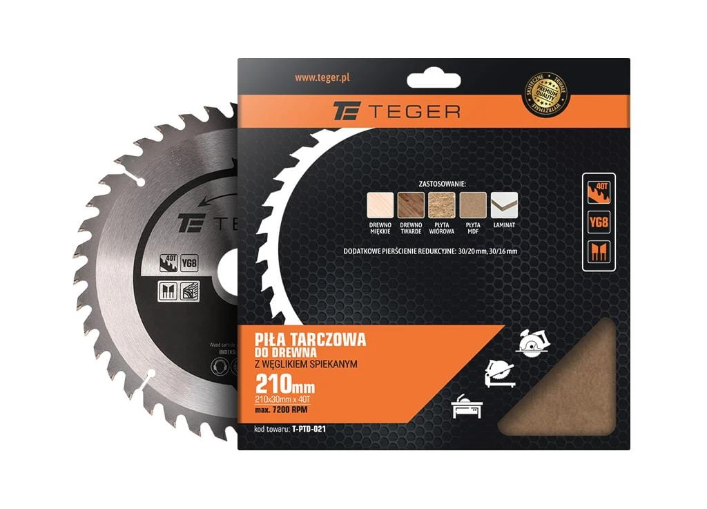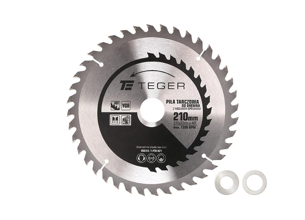 Piła tarczowa do drewna z węglikiem spiekanym 210x30x40T / TEGER przeznaczona do cięcia wzdłużnego i poprzecznego drewna litego, sklejki, płyt wiórowych, płyt laminowanych i MDF, materiałów drewnopodobnych i kompozytowych. Zęby widiowe z węglikiem spiekanym zapewnia długą żywotność tarczy przy intensywnej pracy.