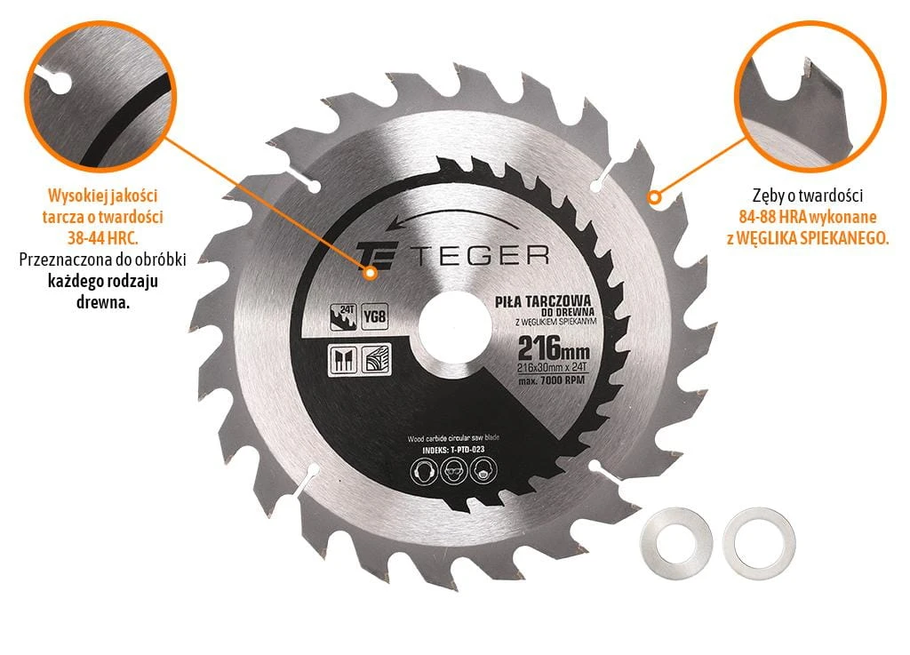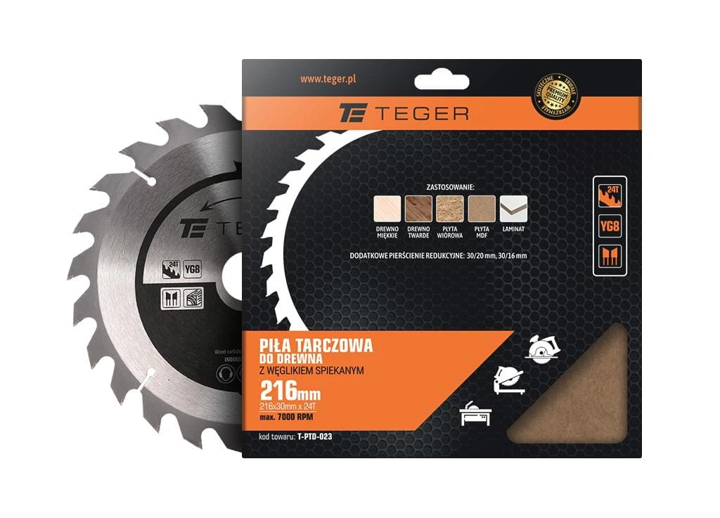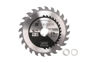 Piła tarczowa do drewna z węglikiem spiekanym 216x30x24T / TEGER przeznaczona do cięcia wzdłużnego i poprzecznego drewna litego, sklejki, płyt wiórowych, płyt laminowanych i MDF, materiałów drewnopodobnych i kompozytowych. Zęby widiowe z węglikiem spiekanym zapewnia długą żywotność tarczy przy intensywnej pracy.