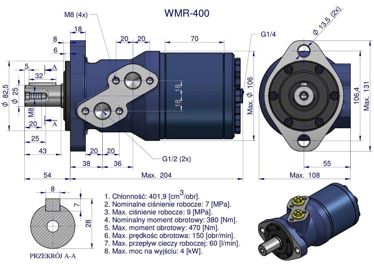 Silnik hydrauliczny orbitalny WMR 400 cm3/obr (70 bar / max.110 bar) Waryński