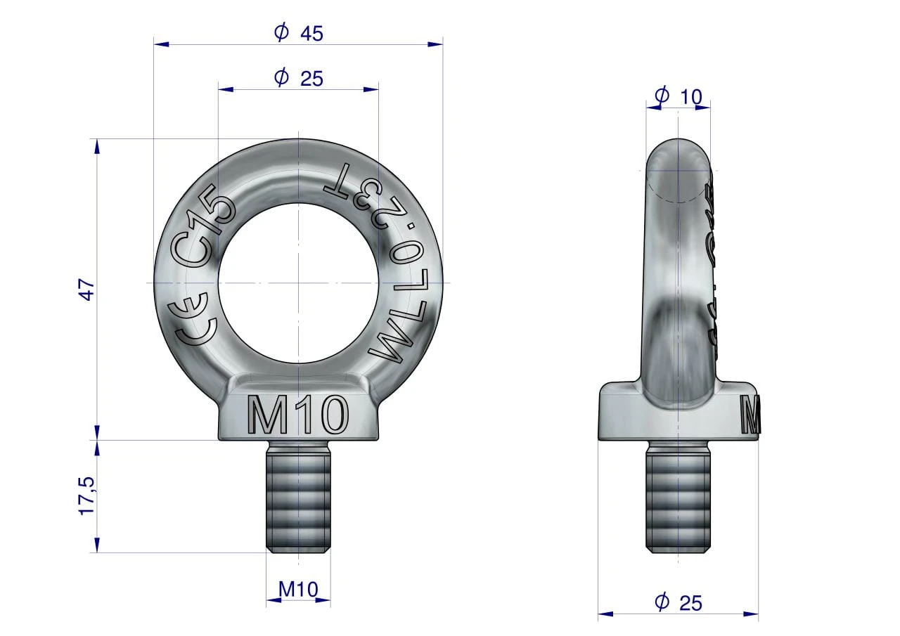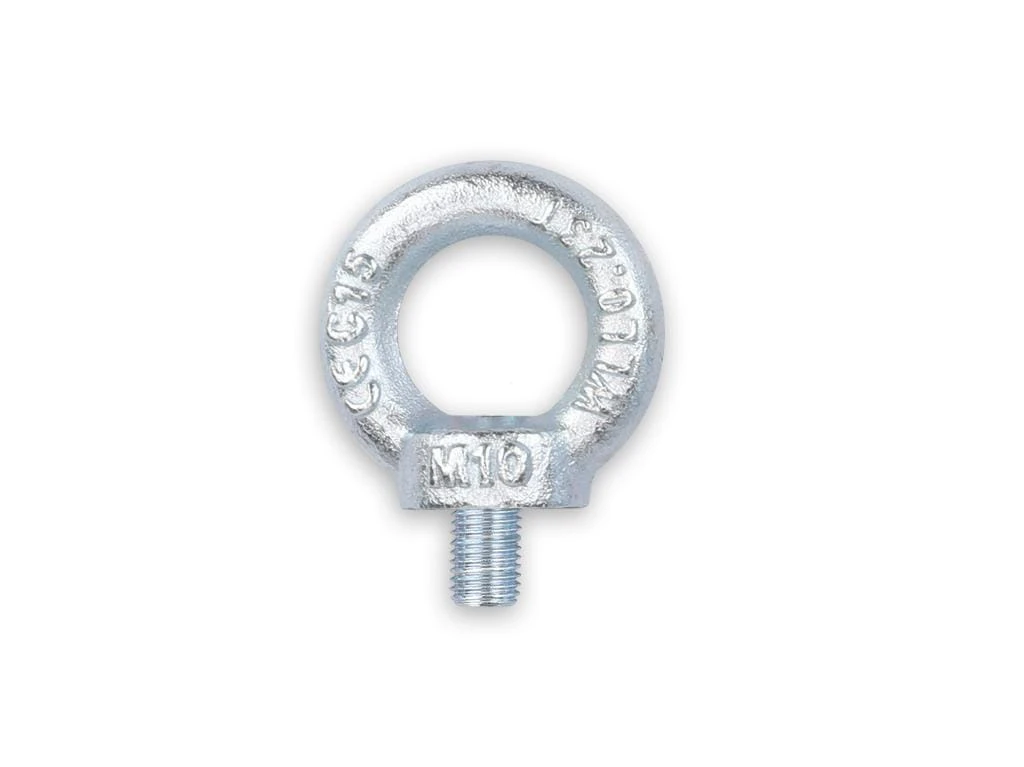 Śruba oczkowa z gwintem metrycznym- służy jako punkt mocowania i zawiesia, umożliwiając bezpieczne przywiązanie lin, łańcuchów lub innych elementów do różnych konstrukcji. Jest powszechnie stosowana w transporcie (np. do zabezpieczania ładunków na naczepach i lawetach), budownictwie (podwieszenia, instalacje) i innych branżach, a jej głównym celem jest utworzenie pewnego punktu zaczepienia dla liny lub haka. /