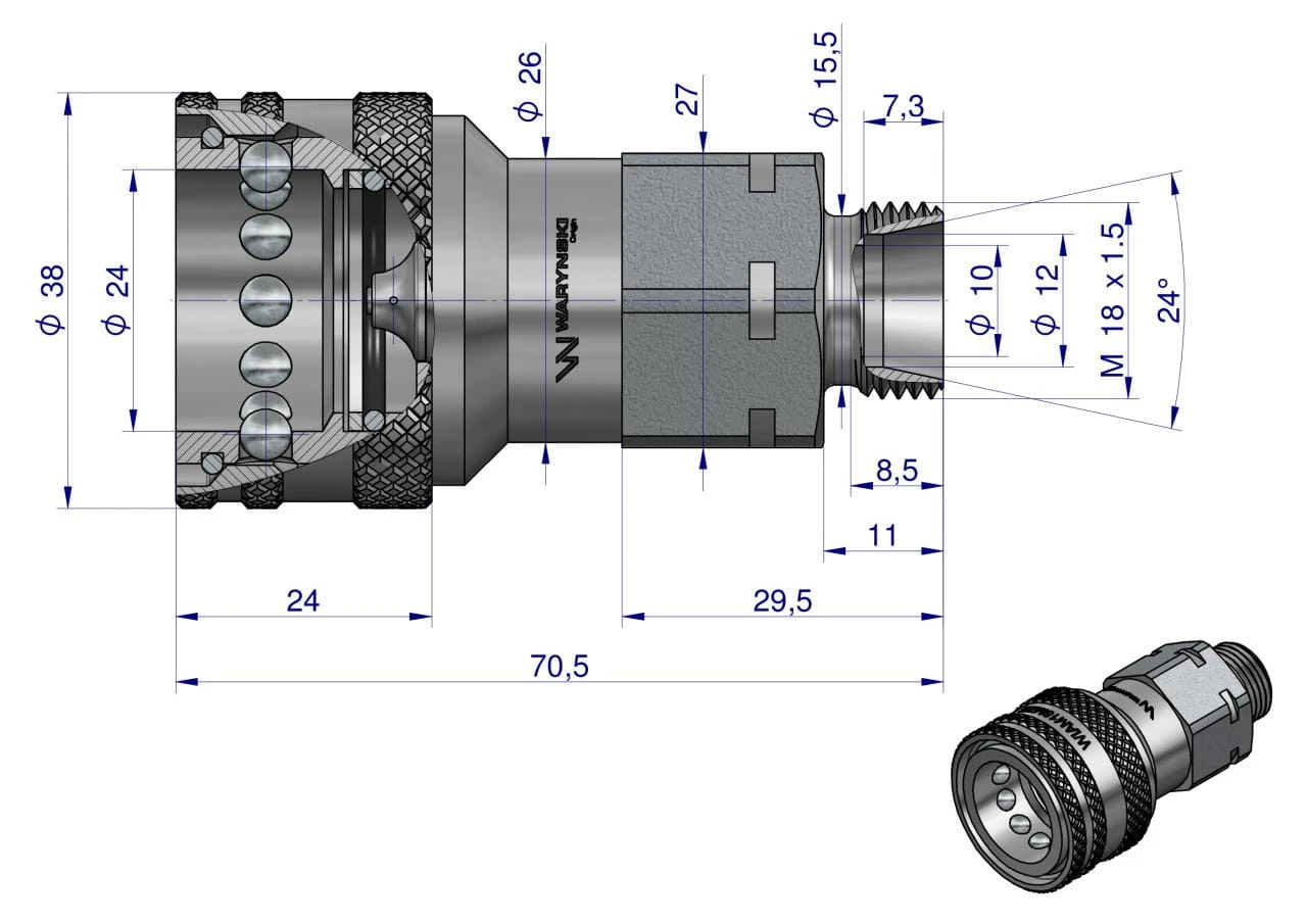 Szybkozłącze hydrauliczne gniazdo z eliminatorem ciśnienia M18x1.5 gwint zewnętrzny EURO (9100818G) (ISO 7241-A) Waryński