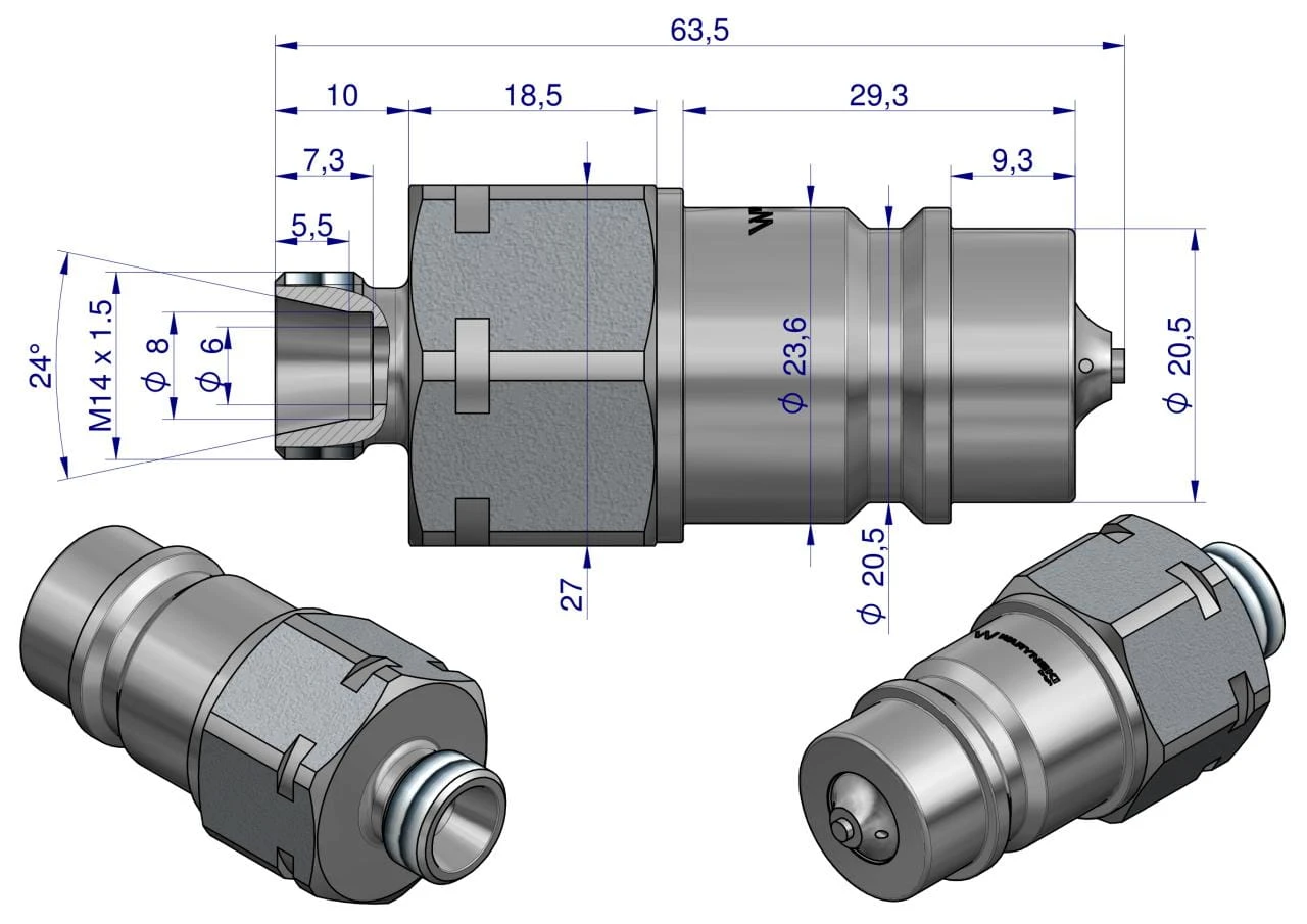 Szybkozłącze hydrauliczne wtyczka M14x1.5 gwint zewnętrzny EURO (ISO 7241-A) z eliminatorem ciśnienia Waryński