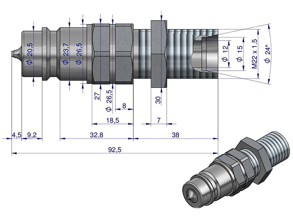Szybkozłącze hydrauliczne wtyczka long z eliminatorem ciśnienia M22x1.5 gwint zew. EURO (9100822W) (ISO 7241-A) Waryński (opakowanie 10szt)
