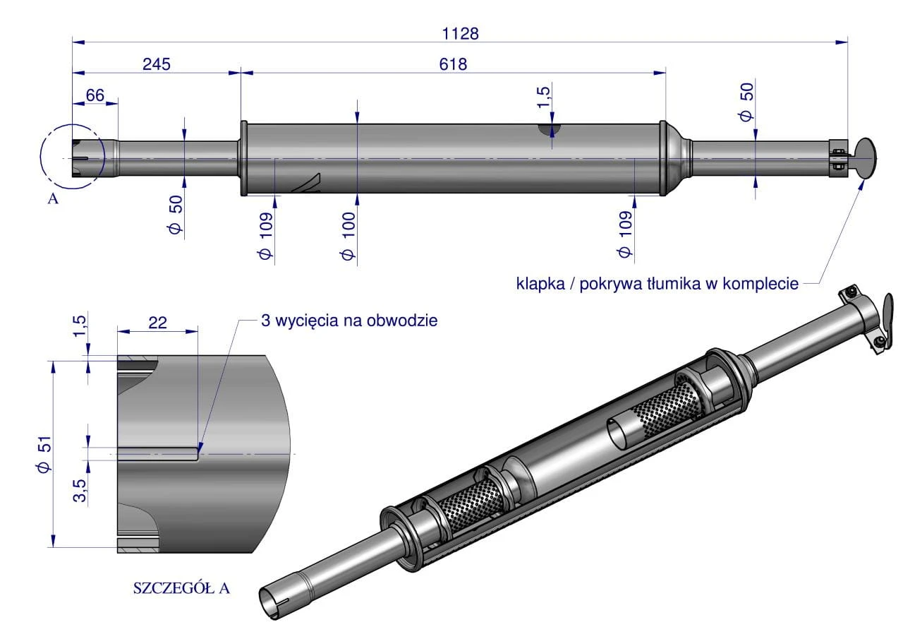 Tłumik 1128mm 3029104M1 4.8kg MF3 C-3603P (prosty) INOX WARYŃSKI