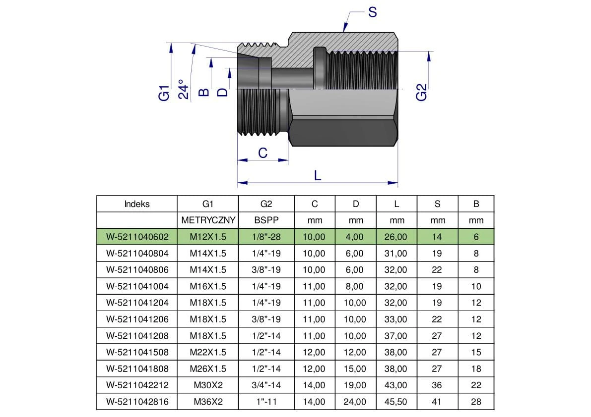 Tulejka różnicowa hydrauliczna AB M12x1.5 06L GZ x 1/8" BSP GW Waryński. Elementy złączne zostały zaprojektowane i wykonane zgodnie z obowiązującymi normami, które szczegółowo opisują wymagania jakościowe i wymiarowe. Są kompatybilne z elementami złącznymi innych renomowach producentów hydrauliki siłowej.