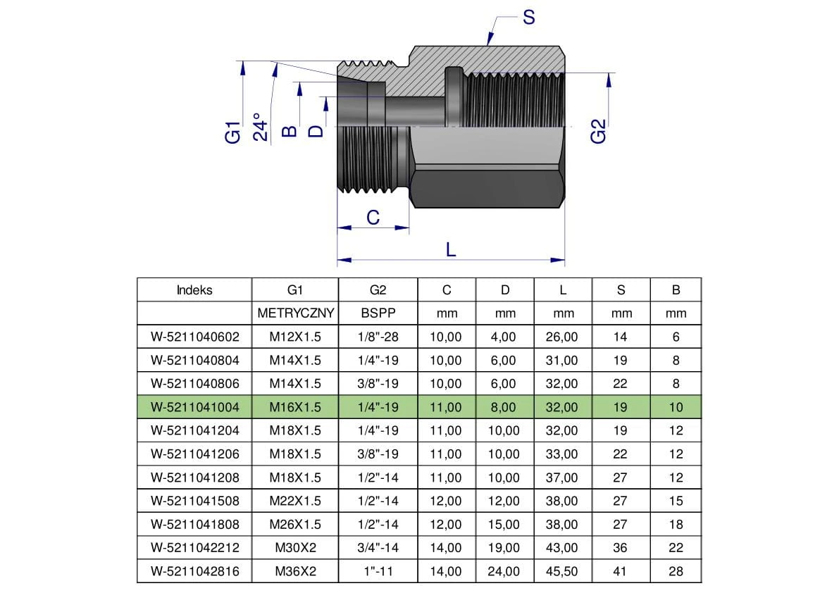 Tulejka różnicowa hydrauliczna AB M16x1.5 10L GZ x 1/4" BSP GW Waryński. Elementy złączne zostały zaprojektowane i wykonane zgodnie z obowiązującymi normami, które szczegółowo opisują wymagania jakościowe i wymiarowe. Są kompatybilne z elementami złącznymi innych renomowach producentów hydrauliki siłowej.