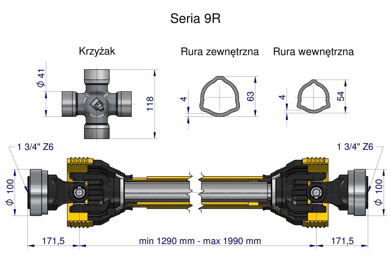 Wał, przegubowo-teleskopowy 1290-1990mm 1890Nm Z6 - 1 3/4 z dwóch stron CE 2020 seria 9R Waryński