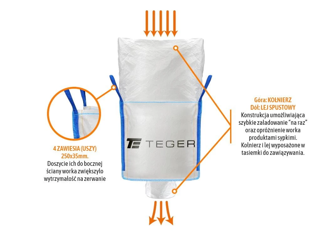 Worek BIG BAG TEGER- zwany również workiem wielkogabarytowym. Jest to elastyczny kontener, który został wykonany z wysokiej jakości tkaniny polipropylenowej, dzięki prostej budowie oraz ergonomicznym kształtom daje możliwość zaoszczędzenia miejsca i łatwego transportu przeróżnych materiałów. BIG BAG TEGER jest to worek o szerokim spektrum zastosowań: -w przemyśle rolniczym: służy do magazynowania zboża, paszy, produktów gotowych - w przemyśle spożywczym: służy do przechowywania żywności - w przemyśle budowlanym: służy do składowania gruzu, odpadów budowlanych, piasku, kruszywa, kamieni ozdobnych Worek BIG BAG TEGER został wyposażony w: -4 zawiesia (uszy) o wymiarach: 250 x 35mm, doszycie ich do bocznej ściany worka zwiększyło wytrzymałość na zerwanie, -Foliową torebka A4 umożliwiającą schowanie dokumentów w celu łatwiejszej identyfikacji, -Konstrukcję z szerokim kołnierzem u góry oraz lejem spustowym na dole, umożliwiającym łatwe i szybkie załadowanie oraz opróżnienie worka. -Dodatkowe tasiemki umożliwiające związanie kołnierza oraz leja, aby zapobiec niekontrolowanemu wysypaniu zawartości worka.