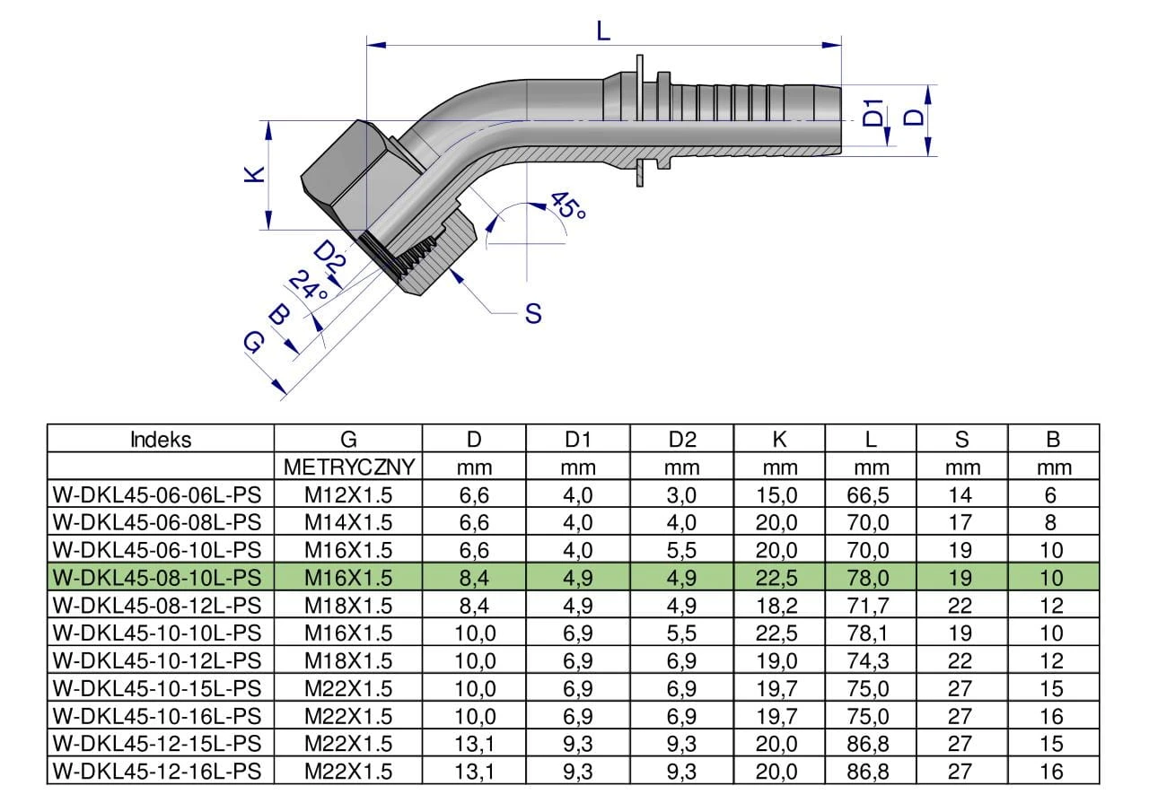 Zakucie hydrauliczne kątowe 45 stopni z gwintem metrycznym wewnętrznym (nakrętka) M16x1,5 (DKL 45 - odmiana lekka) PREMIUM Waryński