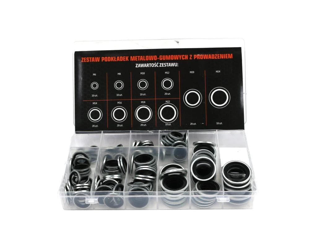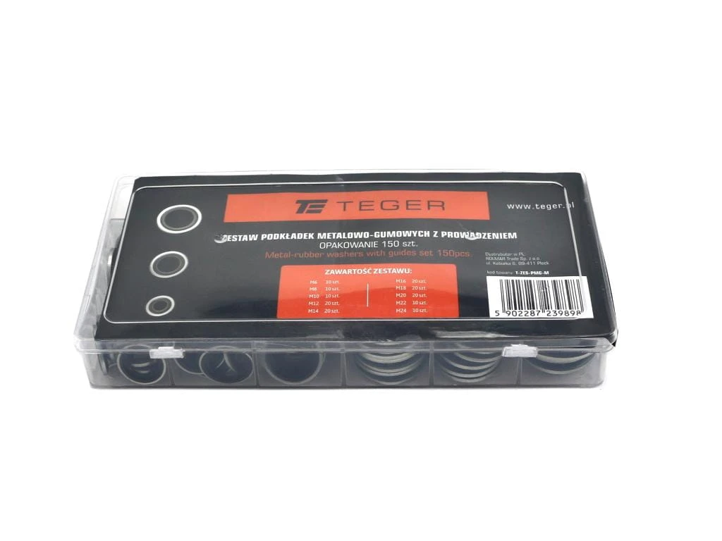 Zestaw podkładek metalowo-gumowych z prowadzeniem 150szt TEGER. W Skład zestawu wchodzi łącznie 150 elementów metrycznych (10 pozycji): T-PMG-PPM06 (10szt); T-PMG-PPM08 (10szt); T-PMG-PPM10 (10szt); T-PMG-PPM12 (20szt); T-PMG-PPM14 (20szt); T-PMG-PPM16 (20szt); T-PMG-PPM18 (20szt); T-PMG-PPM20 (20szt); T-PMG-PPM22 (10szt); T-PMG-PPM24 (10szt).