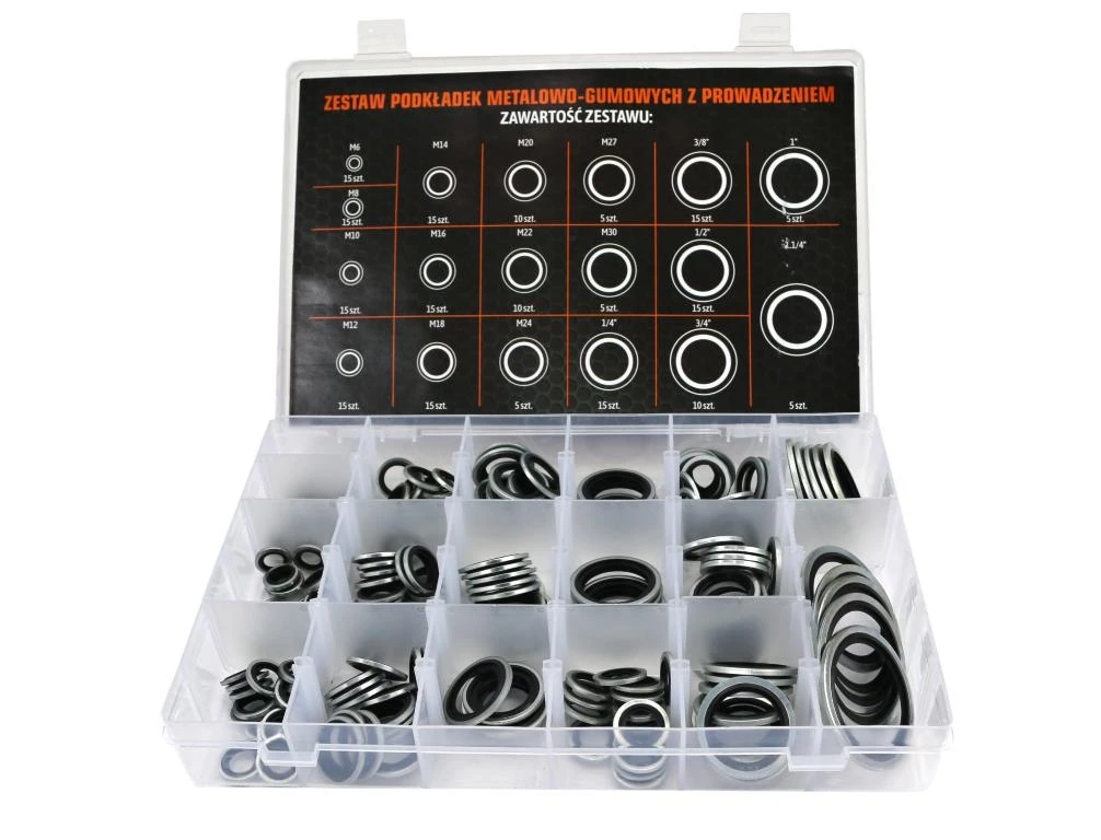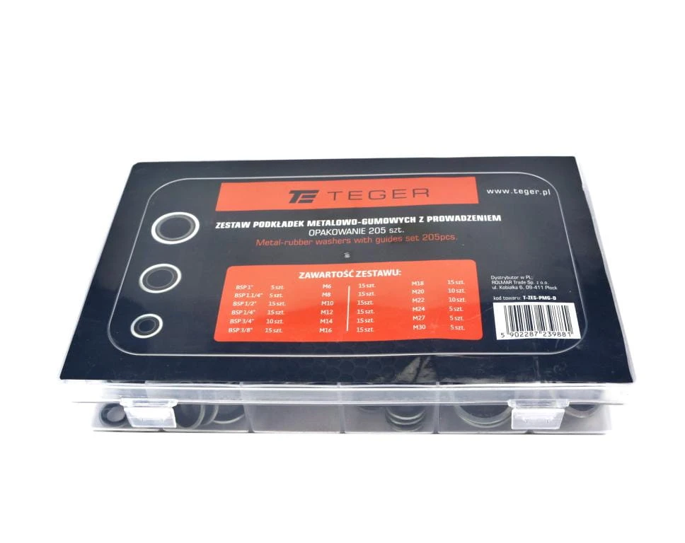 Zestaw podkładek metalowo-gumowych z prowadzeniem 205szt TEGER. W Skład zestawu wchodzi łącznie 205 elementów metrycznych i calowych (18 pozycji): T-PMG-PPG1 (5szt); T-PMG-PPG1.1/4 (5szt); T-PMG-PPG1/2 (15szt); T-PMG-PPG1/4 (15szt); T-PMG-PPG3/4 (10szt); T-PMG-PPG3/8 (15szt); T-PMG-PPM06 (15szt); T-PMG-PPM08 (15szt); T-PMG-PPM10 (15szt); T-PMG-PPM12 (15szt); T-PMG-PPM14 (15szt); T-PMG-PPM16 (15szt); T-PMG-PPM18 (15szt); T-PMG-PPM20 (10szt); T-PMG-PPM22 (10szt); T-PMG-PPM24 (5szt); T-PMG-PPM27 (5szt); T-PMG-PPM30 (5szt).